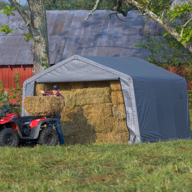Avec cet abri souple de 13m², vous disposerez toujours d’un espace fermé pour le rangement de votre outillage de jardin, votre bois de chauffage, vos deux-roues, brouette ou pour protéger vos biens des intempéries. Il pourra également contenir un quad ou une réserve de paille pour nourrir vos chevaux pendant la saison hivernale. Cet abri démontable fabriqué par Shelter Logic se monte et se démonte rapidement, et s’adapte à tous vos besoins. Il peut être utilisé de façon ponctuelle ou tout au long de l’année, et comme il est démontable il ne requiert aucun permis de la mairie. Lorsque vous ne vous en servez plus, vous pourrez le remiser et disposer de l’espace libéré dans votre jardin.