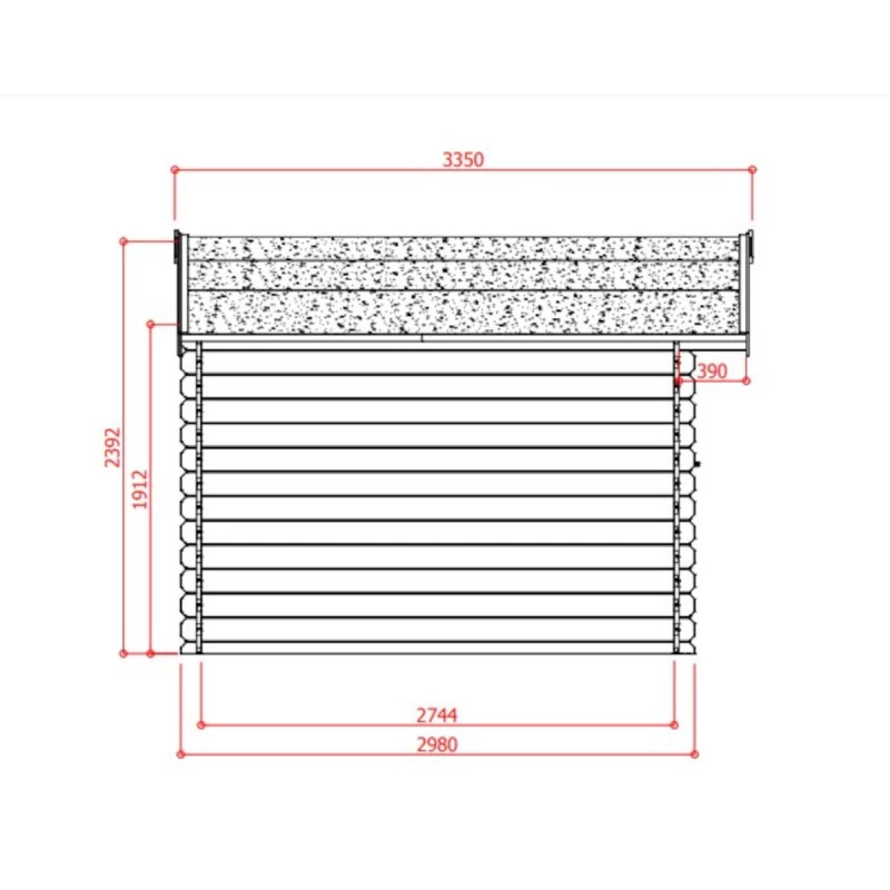 L’abri est à installer sur dalle de béton aux mêmes dimensions que l’abri au sol, soit 358×298. Les dimensions hors-tout de l’abri sont de 408x335cm, avec un rebord de toit en façade de 39cm , qui apportera une protection supplémentaire à la porte et à la fenêtre. Cet abri est réalisé en épicéa du nord, c’est une espèce à pousse lente provenant d’Europe du Nord ou de l’Est, dont les cernes rapprochés témoignent d’une grande densité et solidité. Le bois est certifié FSC, et la garantie de l’abri couvre une période de 2 ans.