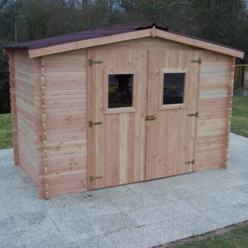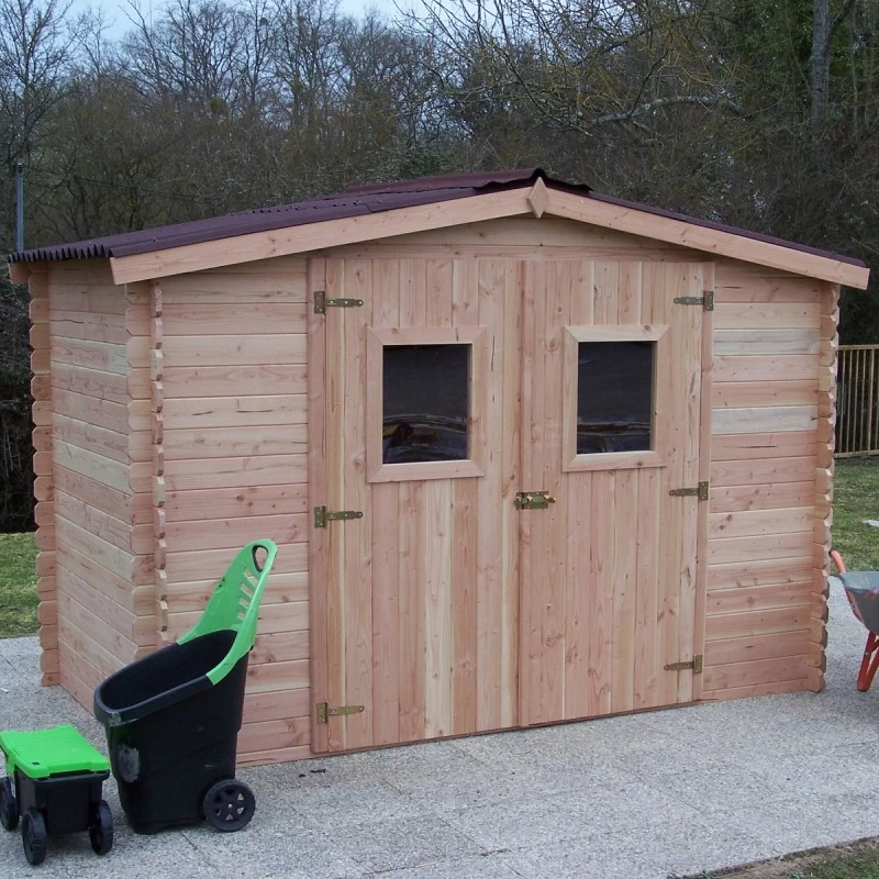 • Abri en bois de belle finition aspect brun-rosé, naturellement durable ne nécessitant pas de traitement chimique