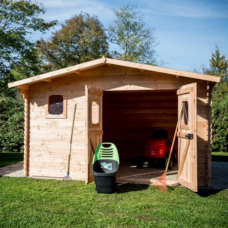 La hauteur faîtière de 2,42m sur des parois de 2,05m développe un beau volume utile, permettant de vous y déplacer en toute aisance et d’y ranger des objets volumineux. Le montage de cet abri se réalise facilement, les madriers robustes de 28mm d’épaisseur en Douglas massif, trié sans aubier, sont munis d’un système de rainures et languettes.