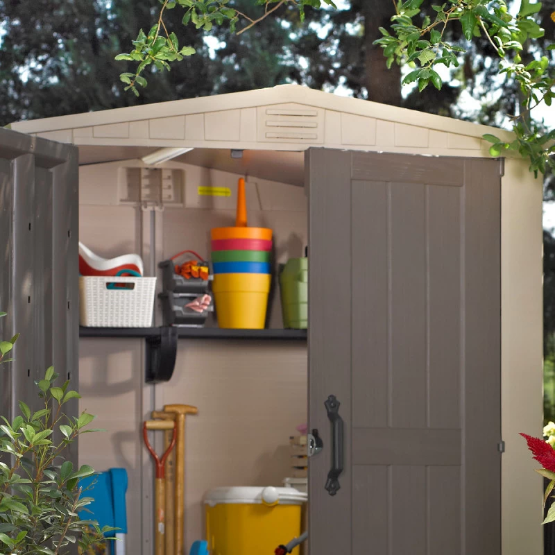 L’abri de jardin Sydney est un nouveau produit de la marque Keter dont la couleur crème, imitation bois s’intégrera parfaitement dans votre extérieur. Son atout majeur, c’est la grande hauteur de ses parois – 187 cm, qui le place parmi les leaders du marché. Livré avec deux étagères, l’abri Sydney vous offrira la possibilité de ranger vos outils de manière propre et ordonnée.