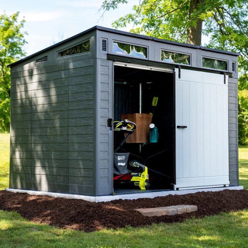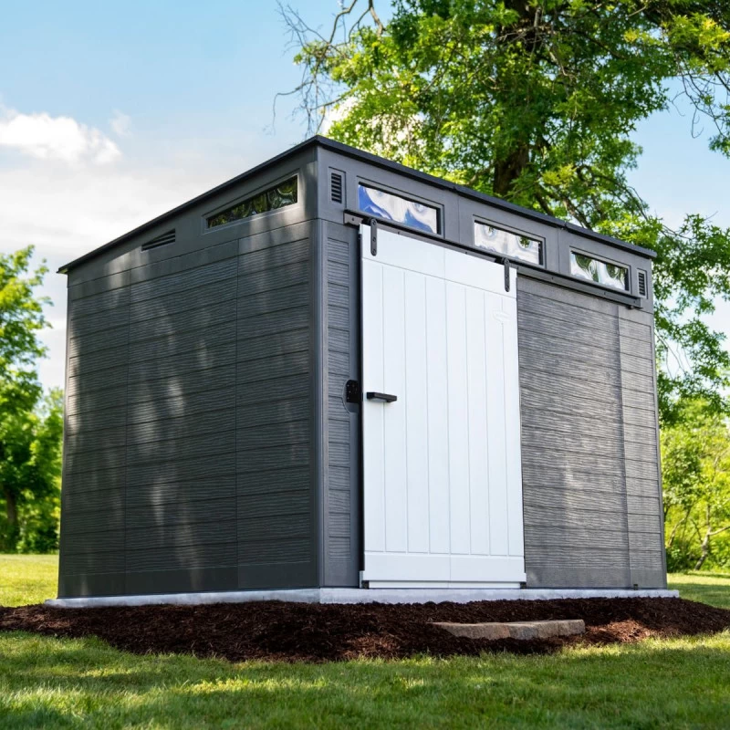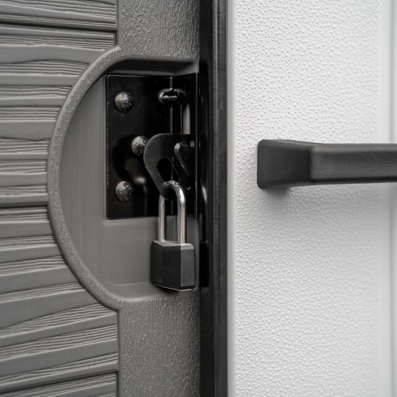 Pour un gain de place maximal, l’abri de jardin en polyéthylène 7,30m² Modern est équipé d’une porte coulissante de type industrielle. Cadenassable (cadenas non fourni) et épaisse de 35mm elle offre un accès facile et met votre contenu en toute sécurité.