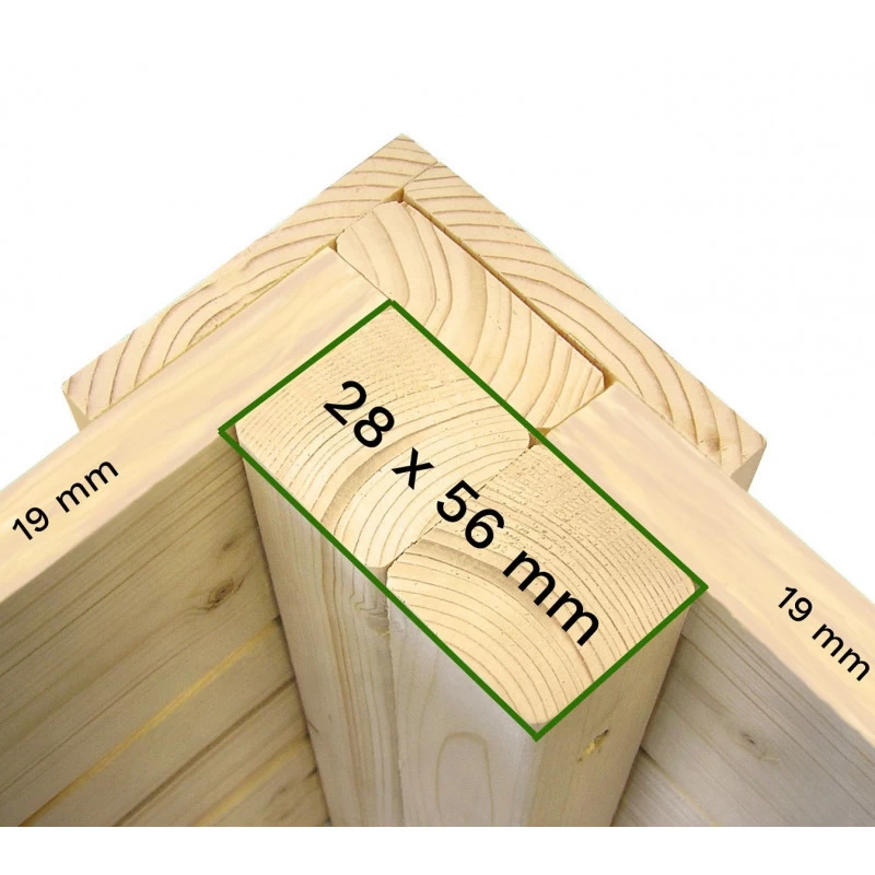 Cette armoire de jardin adossable est réalisée avec des panneaux préfabriqués en bois massif FSC de 19mm d’épaisseur. Cela rend le montage plus facile et plus rapide. Le cadre de 28mm autour des panneaux renforce la rigidité et la solidité de la structure.