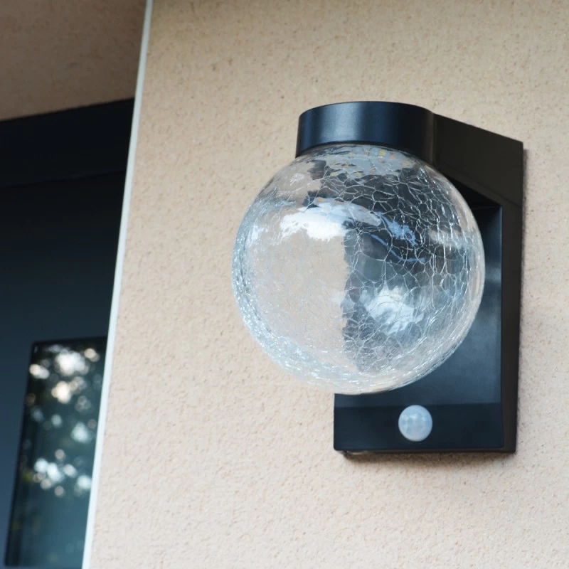Le verre craquelé projette un jeu de lumière originale, avec des motifs ciselés du plus bel effet. La boule en verre, d’un diamètre de 15cm, apportera une belle touche décorative à votre façade. Enfin, l’applique Helios fait office de veilleuse dès la tombée de la nuit, en mode balisage à 10lm, ou en mode éclairage de sécurité pendant 30 secondes à 200lm dès qu’une présence est détectée, pour une distance allant de 5 à 8m avec un angle de détection de 120°.