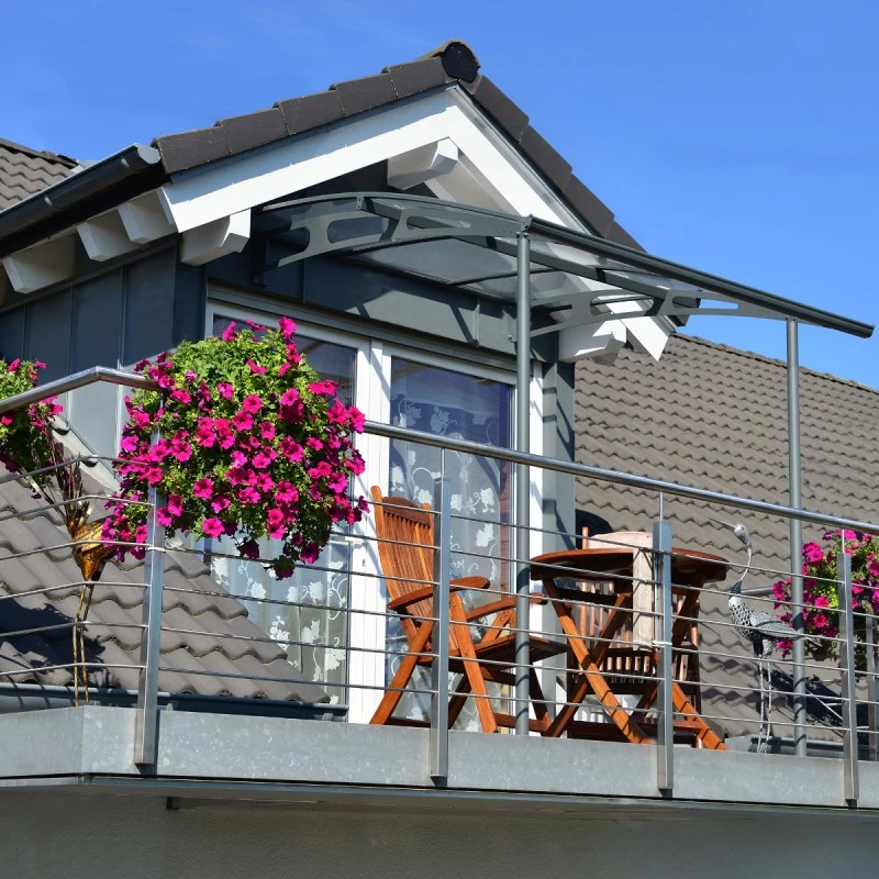 Il ajoutera de la valeur à votre maison ou à votre propriété et vous fournira un espace de détente supplémentaire. Il est composé de panneaux de toiture en acrylique transparent, 100% résistant aux UV, et d’un cadre en aluminium peint par poudrage anticorrosion avec des connecteurs en acier galvanisé. A l’arrière, un joint en caoutchouc garantit une étanchéité entre l’auvent et la façade, et une gouttière intégrée dirige l’eau de pluie latéralement.