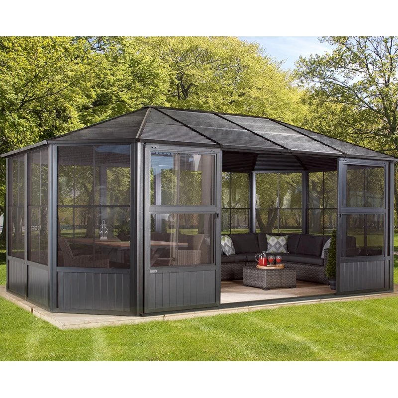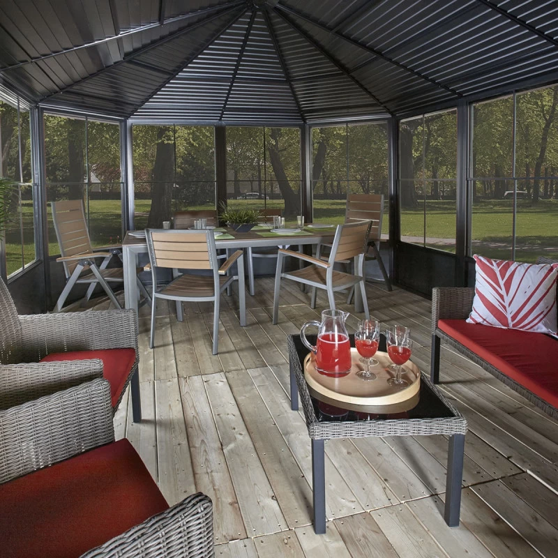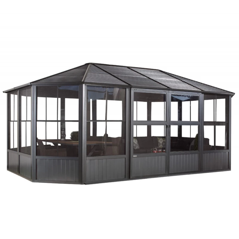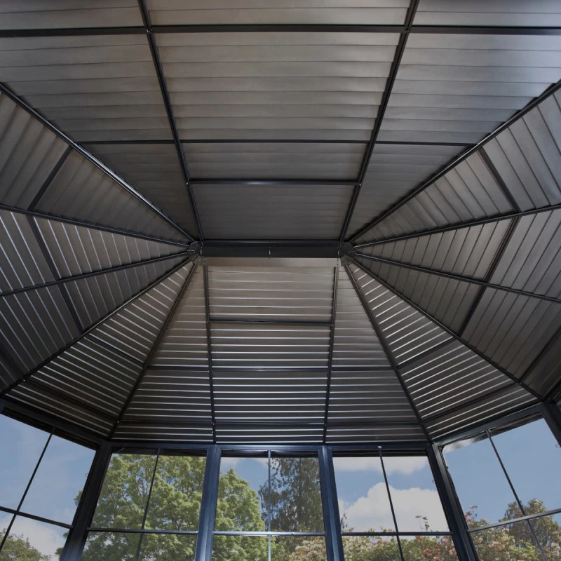 Le pavillon Charleston à 16 pans de Sojag s’inscrit dans un rectangle de 384x594cm de côtés. Il possède une structure robuste en aluminium gris thermolaqué qui ne craint pas la corrosion et qui peut soutenir une charge de neige exceptionnelle de 150kg/m². La hauteur faîtière de la structure est de 280cm, la largeur au sol est de 367x577cm. Le pavillon est composé de 16 panneaux, dont 15 fenêtres à guillotine et une porte double coulissante de 207cm de passage pour une hauteur de 201cm.