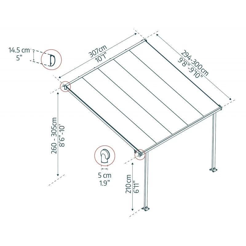 Conçu pour s’intégrer aisément dans votre espace disponible, le toit de terrasse Feria de Canopia by Palram est ajustable en hauteur et en profondeur. La distance entre les poteaux peut aussi varier.