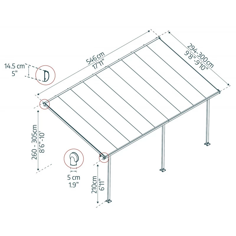 Conçu pour s’intégrer aisément dans votre espace disponible, le toit de terrasse Feria de Canopia by Palram est ajustable en hauteur et en profondeur. La distance entre les poteaux peut aussi varier.